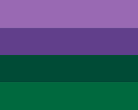 Green is gender neutral, and represents androgyny achieved through the negotiation of masculine and feminine characteristics. Purple is neutral, but s combined from pink/red and blue, which represents androgyny achieved through the combination of masculine and feminine characteristics. Purple and green are also complimentary colours, which represents androgyne being an identity that is masculine and feminine, whilst also being its own separate gender.